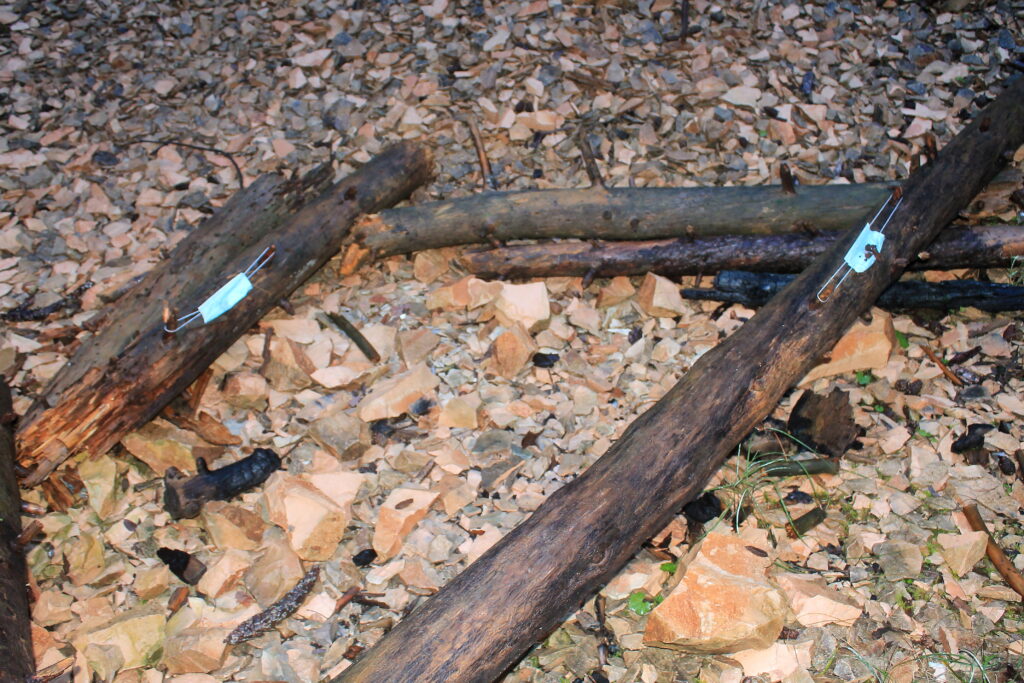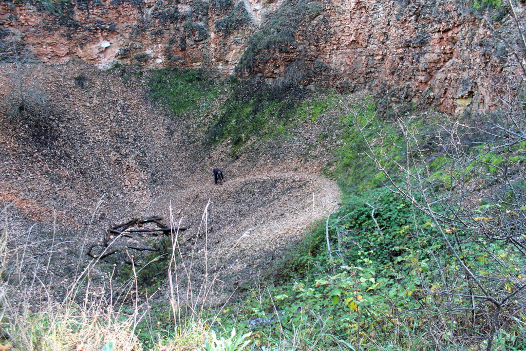 DESCRIZIONE ITINERARIO: Da Villa d’Aria si può proseguire in auto su strada sterrata con fondo sconnesso in salita che inizia dalla parte superiore del paese oppure si parcheggia nel paese e si prosegue a piedi. Si sale nella strada sterrata, passando alla base delle grandi pale eoliche del Monte d’Aria, visibili da tutta la provincia di Macerata, ed in circa 1,5 km si raggiunge la Chiesina denominata “Madonna della Neve” nascosta dentro una piccola pineta (350355,7 E – 4783532,9 N; 790 m.; foto n.3) . Qui se si è giunti in auto si parcheggia e si prosegue a piedi. Dalla chiesina si prosegue a piedi la strada sterrata in lieve discesa per 200 metri fino al primo bivio dove si prende a sinistra (foton.2, cartello “buca”). Dopo 500 metri si scende in un vallone (foto n.4) per poi risalire e raggiungere dei prati con molti arbusti di ginepri in direzione di una vasta pineta. Dopo circa 300 metri si nota una sterrata che si avvicina dalla destra e che si incrocia in corrispondenza del cambio di direzione del vertice della pineta (foto n. 7-8) dove si trova un secondo cartello che indica l’imbocco del sentiero che entra nella pineta e che, in 150 metri, conduce alla voragine (351199,7 E – 4784530,2 N; 790 m.).