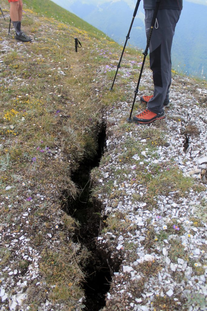 1-Primi massi ed alberi abbattuti nel fondo della Val di Bove, sulla verticale de “Le Quinte”. 2-La base de “Le Quinte” con la grande conoide detritica prodotta dalle numerose frane, ma la grande frana ancora non era visibile. 3-Val di Bove, versante sud de “le Quinte” con la grande frana del camino centrale. 4- Parete nord del Monte Bicco con la grande frana dello spigolo est. 5- Le proporzioni della frana in confronto con Stefano, in basso a destra.I massi grigi sono vecchi crolli. 6- Il grande masso dove sta Stefano si è fermato sul sentiero Val di Bove – Forcella Passaiola. 7- Anthocharis belia euphenoides, esemplare maschio di una rara farfalla di montagna in Val di Bove. 8- Camoscio curioso sulla cresta est del Monte Bicco. 9- Camosci sulla cresta est del Monte Bicco. 10-Parete nord del Monte Bicco, un camoscio al pascolo 10 metri sotto di noi tra decine di fiori alpini. 11- la scarpata cosismica alta circa 50-60 centimetri all’inizio del sentiero che dai campi da sci di Frontignano (termine sciovia Jacci di Bicco) sale verso il Monte Bove Sud. 12- La scarpata cosismica continua per altri 500 metri nel versante sud di Monte Bove Sud in direzione di Passo Cattivo. 13- Il Passo Cattivo con tre enormi frane cadute dal versante ovest verso la valle di Macchie di Vallinfante. 14- Una grande frattura profonda diversi metri taglia tutta la strada al Passo Cattivo, preludio della distruzione che segue. 15- La prima di decine di fenditure aperte nei prati di Passo Cattivo, si nota il taglio ed il distacco nelle due parti di roccia al lati della spaccatura. 16- In questa spaccatura profonda oltre due metri sembra che le onde sismiche hanno schizzato i sassi ai lati del cratere. 17- Uno dei torrioni che caratterizzano il versante ovest del Passo Cattivo parzialmente franato, sullo sfondo il paese di Castelsantangelo sul Nera. 18- Un’altra fenditura in prossimità della cresta di Passo Cattivo, ci entrano i bastoncini per tutta la loro lunghezza !!! 19- Salendo per il sentiero verso Cima di Vallinfante le fenditure sono ovunque, saliamo con attenzione con il timore di sprofondare anche noi. 20- Quel che rimane di uno dei torrioni di Passo Cattivo spaccati e franati, la prossima volta che ripasseremo forse anche questa foto sarà cambiata. 21- Sul bordo della seconda frana, di fronte i torrioni spaccati della foto n. 20. 22-La cima sovrastante Passo Cattivo, che precede la Cima di Quota 2065 m., con il versante ovest completamente franato. 23- Il pendio sottostante la cima della foto n.22. Al centro il Colle la Croce ed il camping M. Prata, a destra l’abitato di Vallinfante. 24- Veduta verticale sotto alle pareti di Passo Cattivo con le grandi conoidi detritiche prodotte dalle tre frane fermate dal bosco sottostante, sullo sfondo l’abitato di Macchie di Vallinfante. 25- La Cima senza nome che precede quella di quota 2065 m. franata e percorsa da una profonda fenditura. 26- La incredibile e profonda fenditura che percorre tutta la cima sovrastante Passo Cattivo, qui la montagna si è separata e divisa in due, la cotica erbosa caduta al suo interno ha ripreso vita. 27- Nella fenditura la roccia mostra la parte superiore esposta agli agenti atmosferici più grigia e quella che una volta stava sottoterra più bianca, qui si vede nettamente lo stravolgimento compiuto dal terremoto. 28- La parte finale con sorpresa della fenditura delle foto n.26-27. 29- La sorpresa finale , la fenditura termina in prossimità della cresta con un profondissimo e strettissimo taglio, Stefano scende per oltre un metro sottoterra, sullo sfondo la Cima di Quota 2065 m. che precede la Cima di Vallinfante. 30- Il solco si fa sempre più stretto scomparendo apparentemente oltre la cresta, qui il bastoncino non toccava il fondo, più avanti si. 31- Nigritella widderi a quota 1700 metri nel canalone dei campi da sci del Monte Cornaccione, non l’avevo mai vista così in basso. 32- Con questa immagine di un coleottero alpino, il Trichius fasciatus su Anthemis usciamo dall’inferno con la speranza di non dover vedere più altre distruzioni.