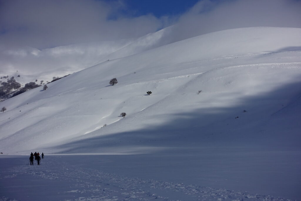 1- La partenza da Pian Perduto, sullo sfondo il Monte Argentella da cui tracima la nebbia dal versante Est.2- Il boschetto dei Colli Alti e Bassi che abbiamo raggiunto per la valletta Ovest.3- Il Boschetto dei Colli Alti e Bassi con il Monte Porche sullo fondo.4 – 5-Le pendici Ovest della Cima del Redentore tra la nebbia.56 – 9-Dai Colli Alti e Bassi scendiamo verso la valle che conduce alla Capanna Ghezzi.78910 – 13- La valletta che conduce verso Capanna Ghezzi.11121314 – 15- I nuclei di Faggio nei pressi della Capanna Ghezzi.1516- La Capanna Ghezzi, alle falde del versante Ovest del Monte Argentella.17- La Macchia del San Lorenzo18- La conca del San Lorenzo.19- Il Monte Palazzo Borghese visto da San Lorenzo.20 – 21- La Portella del Vao, la strettoia rocciosa che mette in comunicazione San Lorenzo con il Pian Perduto.2122 – 23- Il Monte Porche ed il Monte Palazzo Borghese dominano la conca del San Lorenzo.2324- I Colli Alti e Bassi chiudono a Sud il Pian Perduto.25- Attraversando il Pian Perduto 26- Ripassiamo di fronte al boschetto del Pian Perduto chiudendo il percorso della giornata.27- Il Monte Lieto, situato di fronte al Pian Perduto, sulla strada una lunga fila di auto di escursionisti..28- Siamo ormai giunti anche noi all’auto concludendo la splendida ciaspolata.29- Pianta satellitare del percorso della ciaspolata