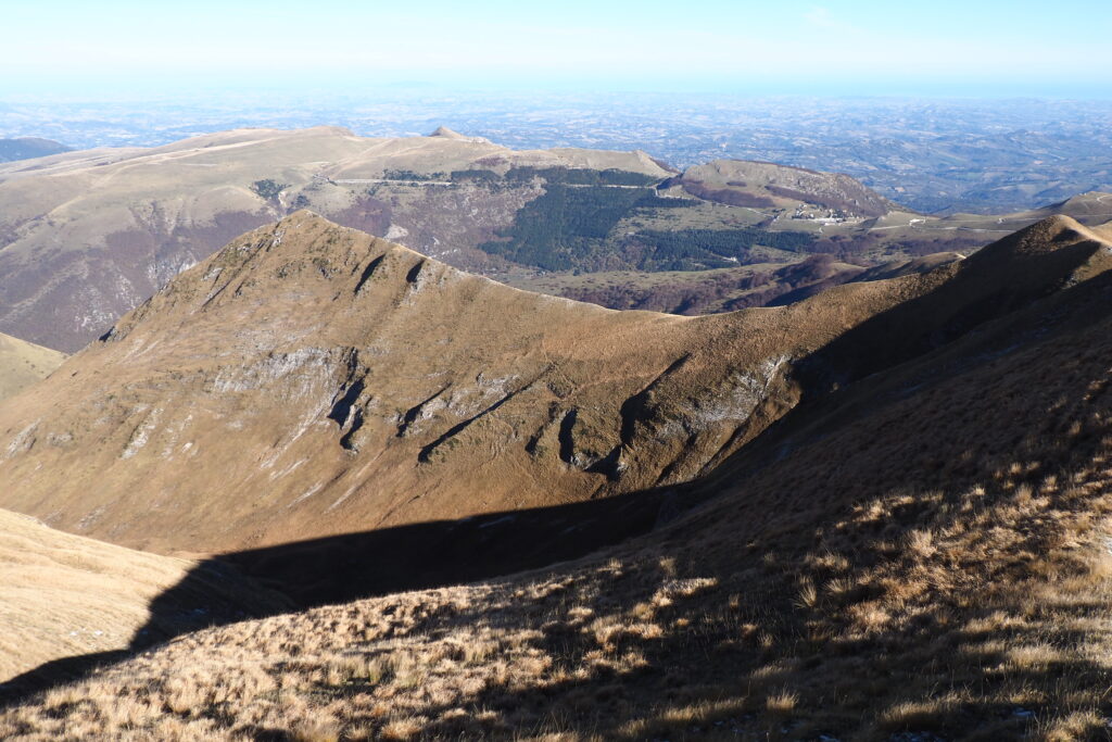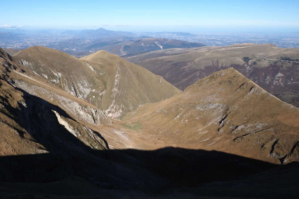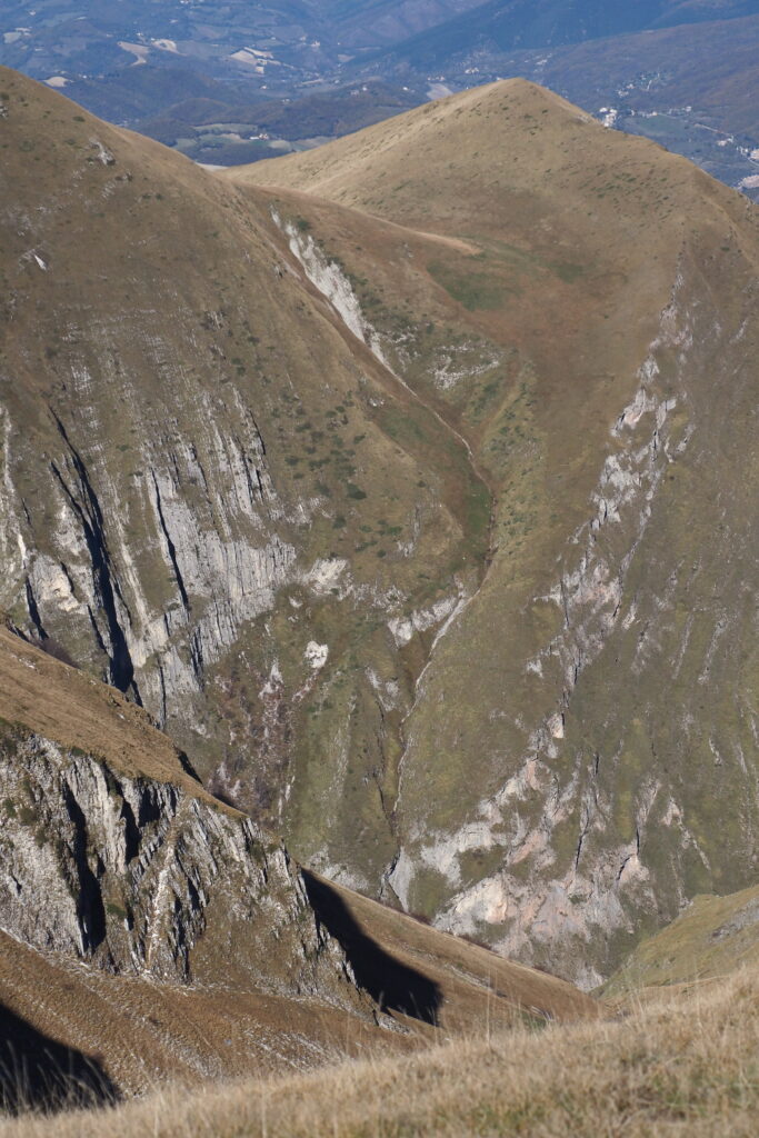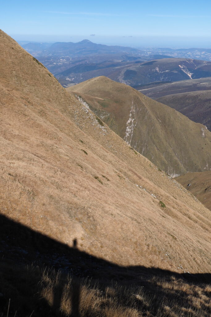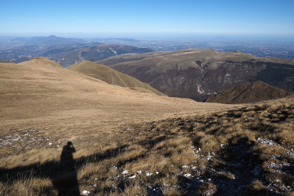 24- La cima di sinistra con la mia ombra proiettata verso i ripidi pendii della Val di Tela e verso il Monte Cacamillo, sullo sfondo il Monte San Vicino.