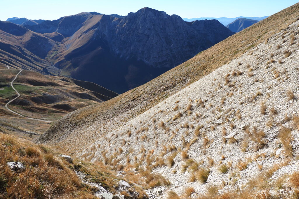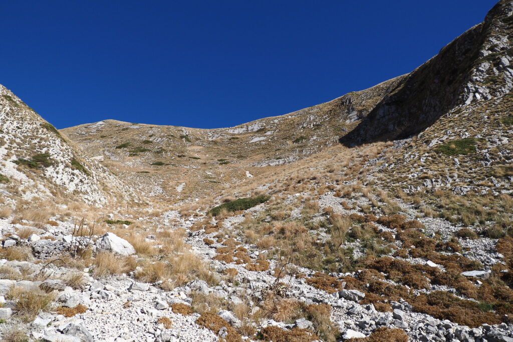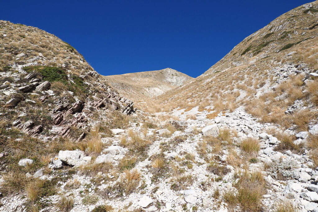 18- Il Monte Bove Nord emerge dall’aridissimo e detritico pendio di sinistra del canale.
