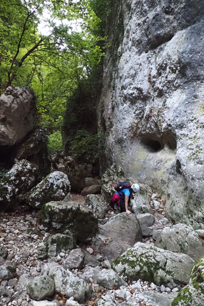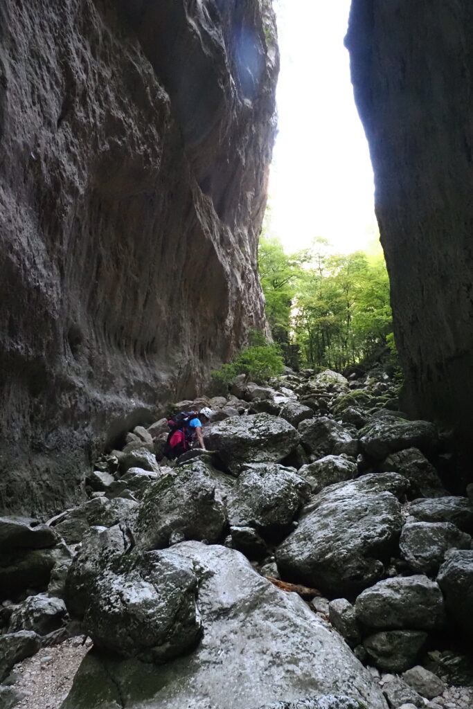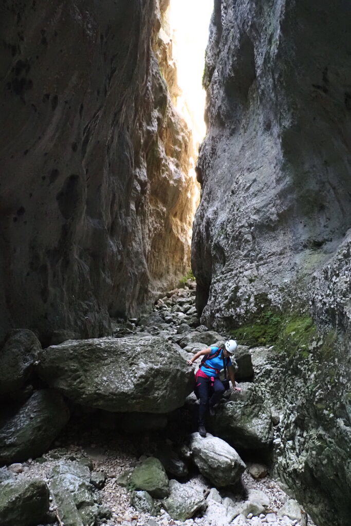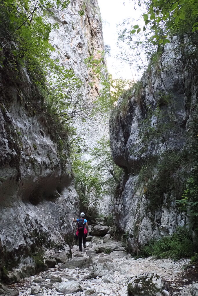 PARTE FINALE DELLA RORR DEL VINADIA: Se invece si risale il torrente Vinadia raggiungendo i Casolari Vinadia dalla strada Statale n.52 che da Tolmezzo conduce verso Villa Santina, si apre uno scenario completamente diverso, una vallata con profilo a “V” ampia e con pareti altissime con un fondo senza scorrimento idrico ma con la presenza di alcuni laghetti dove bisogna bagnarsi fino alle ginocchia e anch’esso caratterizzato a tratti da cumuli di grandi massi che rendono complicato il tragitto, in alcuni tratti bisogna passare sotto ai massi stessi, tassativo il casco.