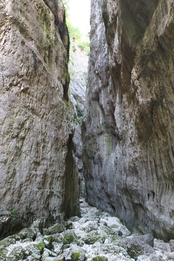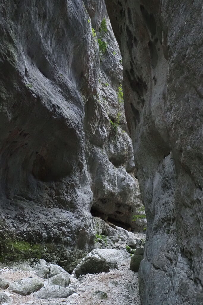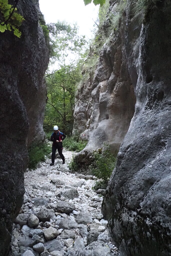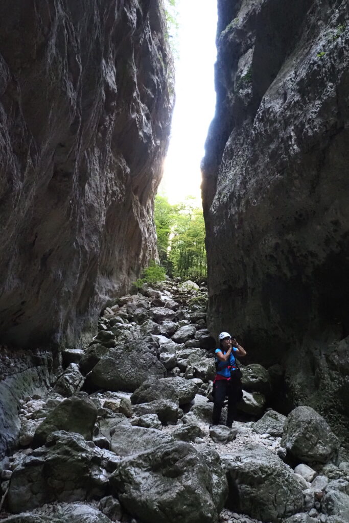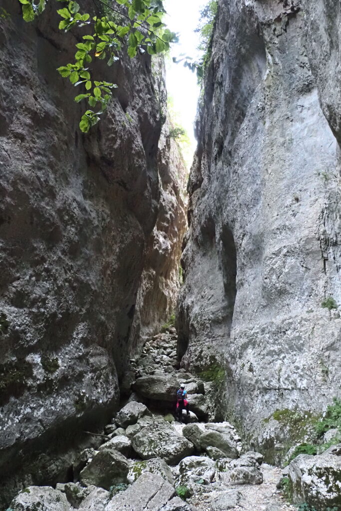 PARTE FINALE DELLA RORR DEL VINADIA: Se invece si risale il torrente Vinadia raggiungendo i Casolari Vinadia dalla strada Statale n.52 che da Tolmezzo conduce verso Villa Santina, si apre uno scenario completamente diverso, una vallata con profilo a “V” ampia e con pareti altissime con un fondo senza scorrimento idrico ma con la presenza di alcuni laghetti dove bisogna bagnarsi fino alle ginocchia e anch’esso caratterizzato a tratti da cumuli di grandi massi che rendono complicato il tragitto, in alcuni tratti bisogna passare sotto ai massi stessi, tassativo il casco.