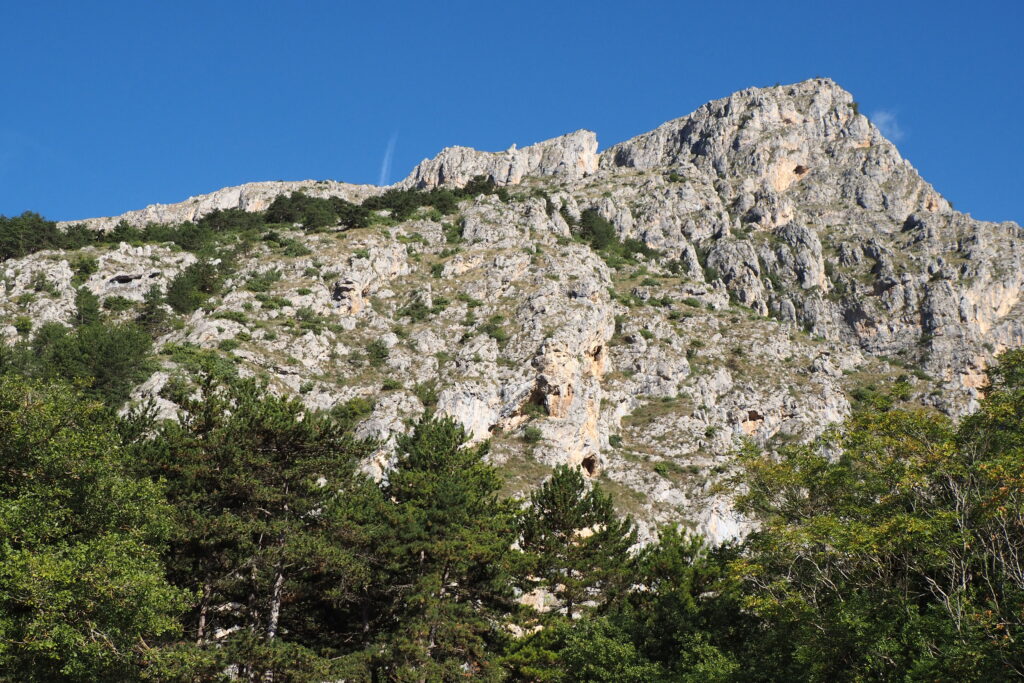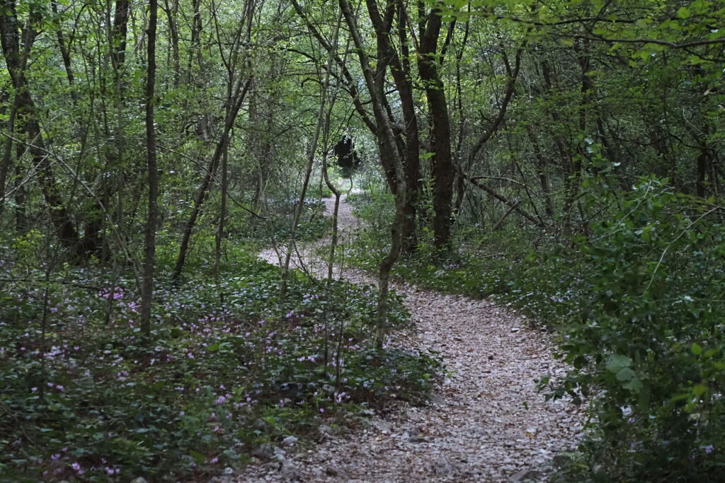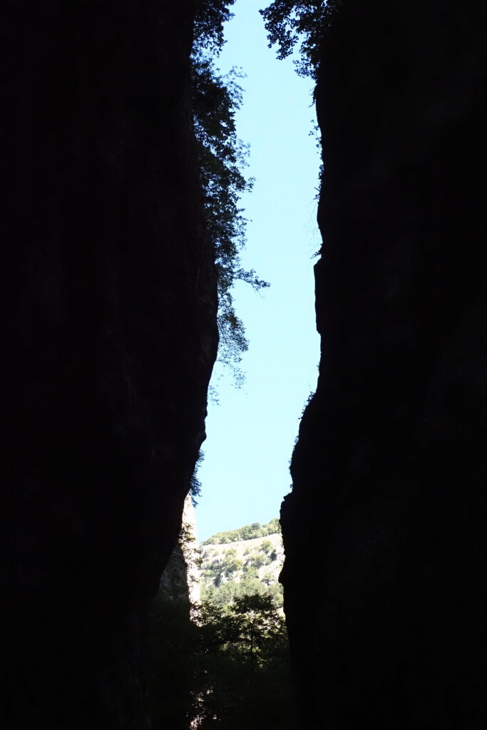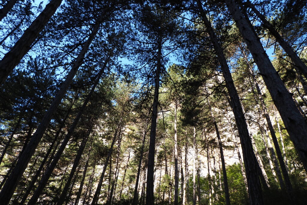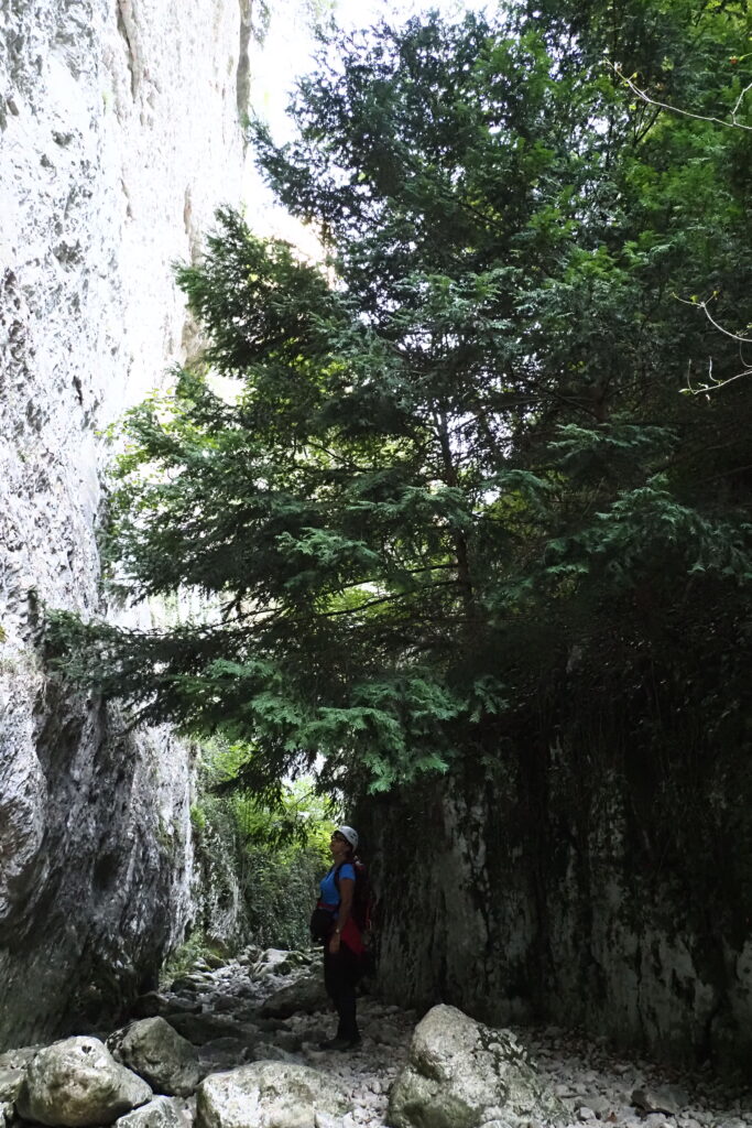 La prima parte è un po’ deludente in quanto si percorre la valle, in questo tratto ampia, all’interno di un folto rimboschimento di Pini che nasconde alla vista le pareti della gola.