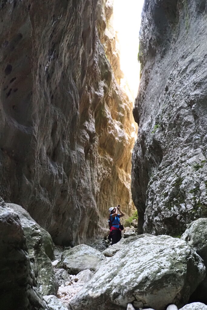 Indispensabili scarponi da trekking perché la forra è molto scivolosa, casco e frontale.