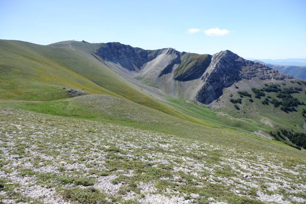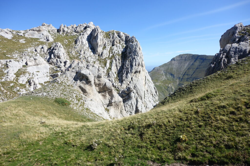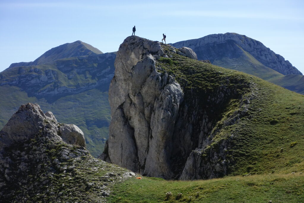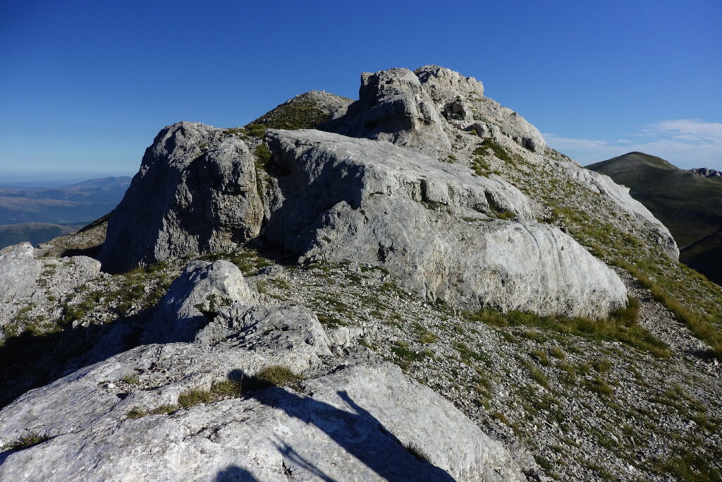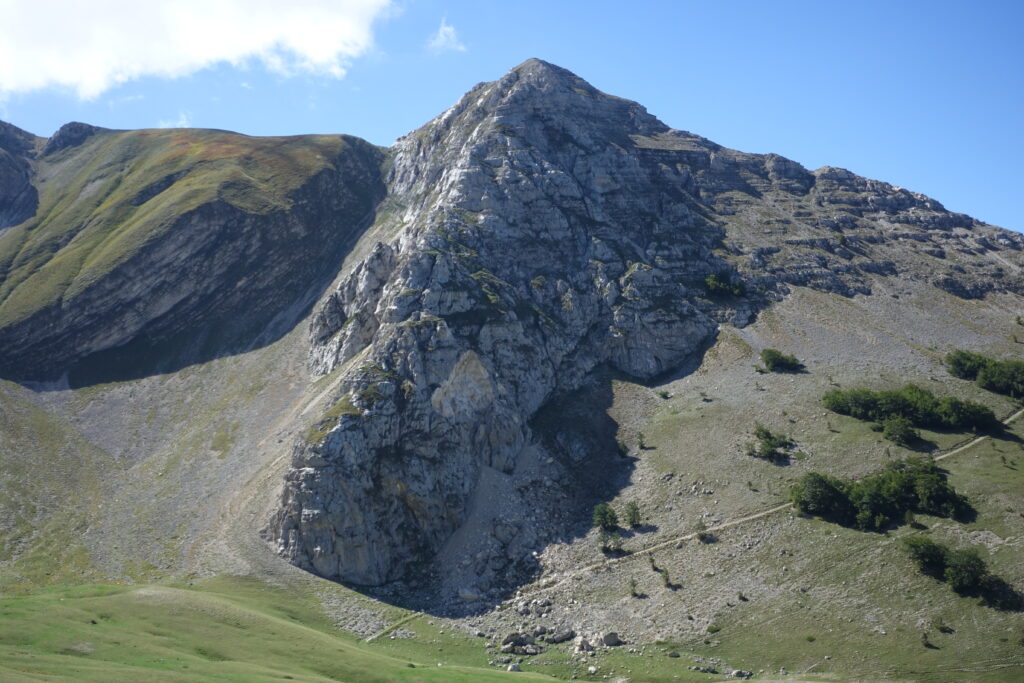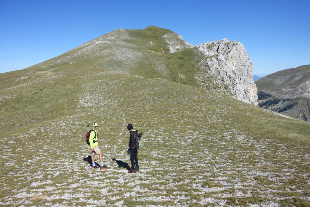 Si ritorna indietro sulla cresta erbosa e si continua a risalirla seguendo gli ometti di pietra fino a raggiungere le prime paretine rocciose (1,3 ore dall’auto).