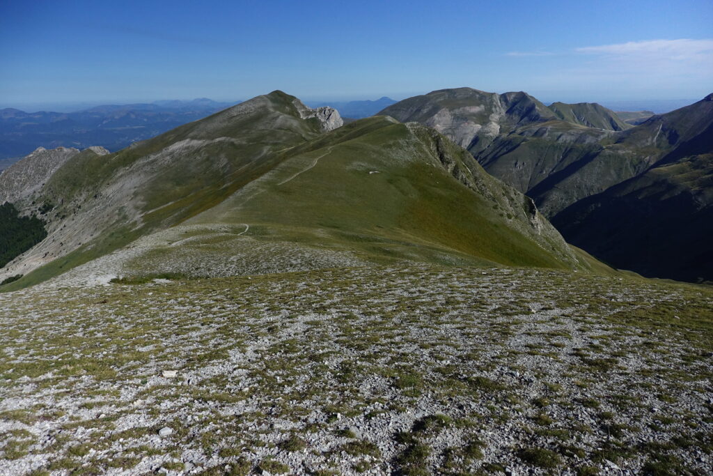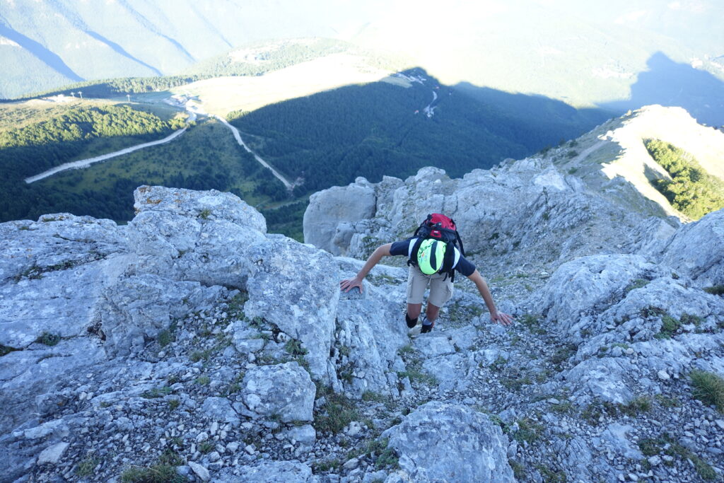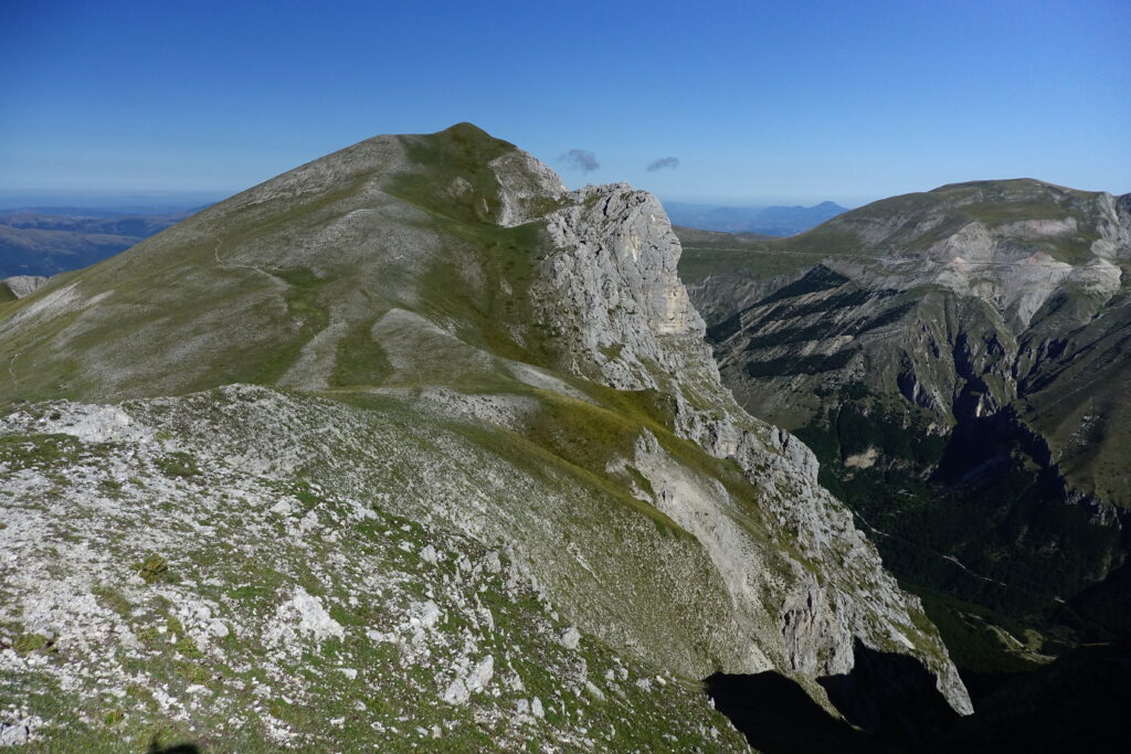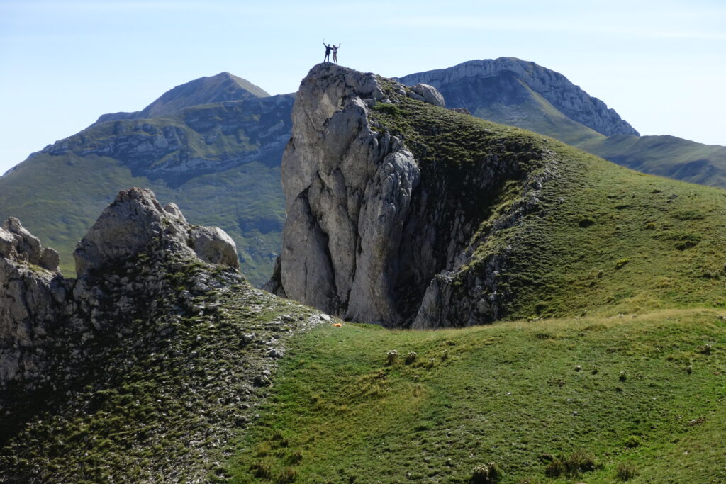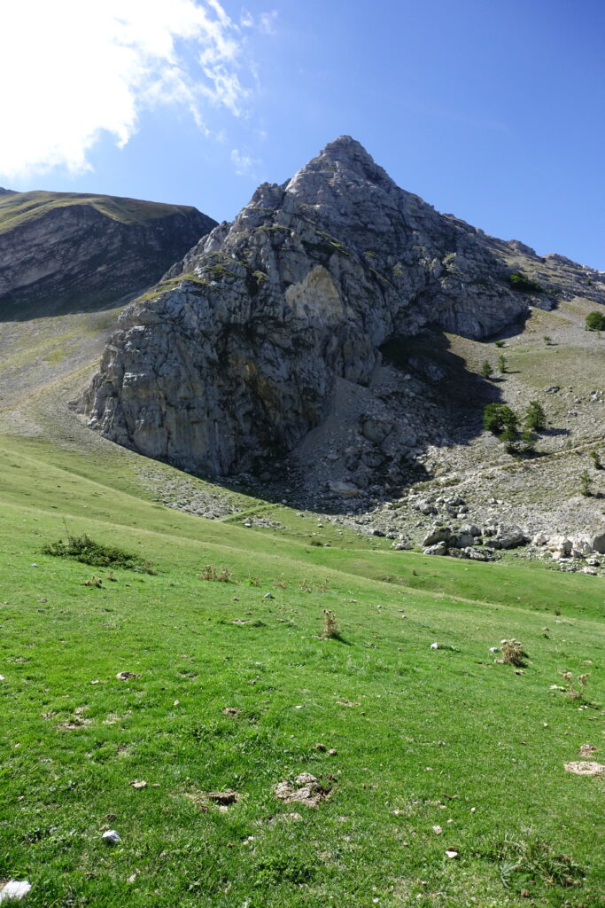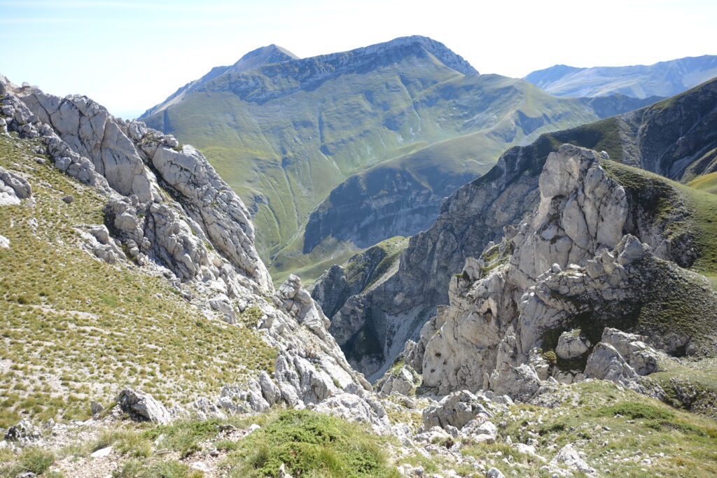 Si ritorna indietro sulla cresta erbosa e si continua a risalirla seguendo gli ometti di pietra fino a raggiungere le prime paretine rocciose (1,3 ore dall’auto).