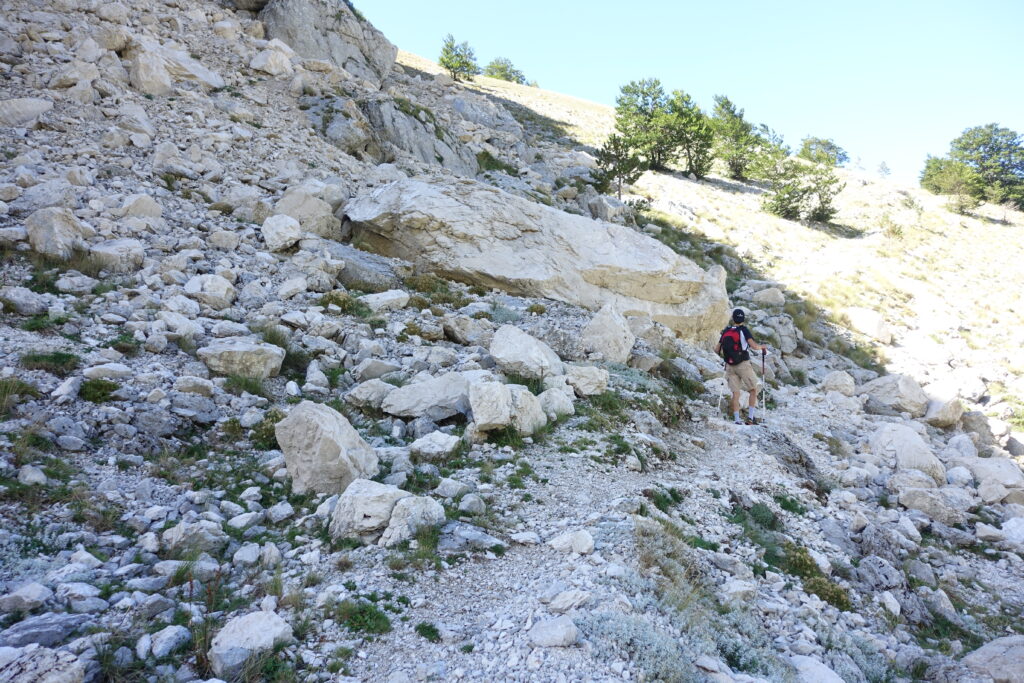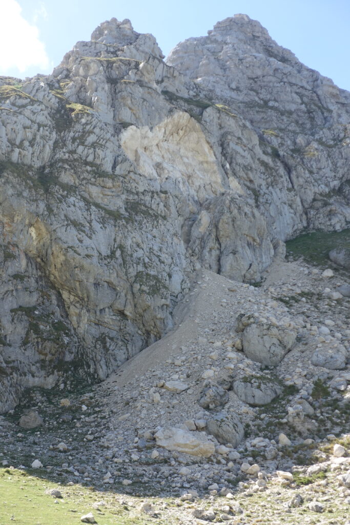 Ne abbiamo percorso il primo tratto per poter fare la descrizione e, con l’occasione, abbiamo anche integrato la segnaletica a terra con ometti di pietre per trovare più facilmente l’attacco ma principalmente siamo saliti per andare alla ricerca del Grottone alla Bandita, una grotta che il mio amico Patrizio, esperto e tenace ricercatore di grotte dell’Appennino, aveva cercato invano già un’altra volta.