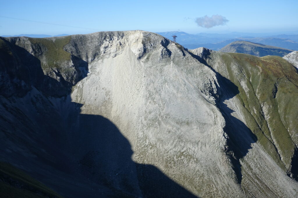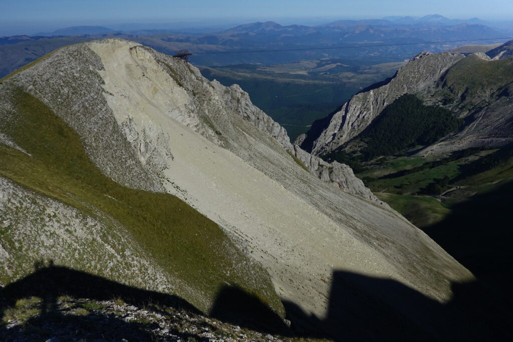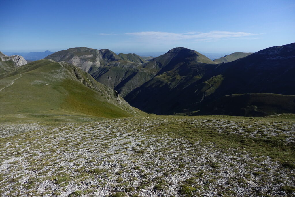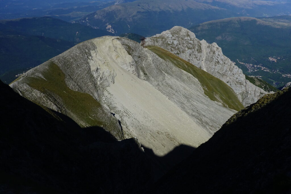 Oppure dalla sella deviare a destra in quota per traccia di sentiero, attraversando due canali ghiaiosi, verso la sommità delle Quinte, costeggiando la base delle pareti sovrastanti e salire direttamente la ripida cresta rocciosa che sale dalle Quinte verso la cima della Croce di Monte Bove dal versante Sud (40 minuti, vedere l’articolo “I terrazzi da brivido dei Monti Sibillini – parte I”).
